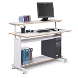 This mobile computer workstation is sure to be a welcome convenience in the home or office where a relocatable task desk is needed at times. An elevated desk top and lower utility shelf join an extending keyboard tray to offer the basics, and the four-wheel caster base means this desk can be moved easily with a locking wheel function for secure placement. Features: Mobile computer desk features a durable powder-coated steel frame Mobile computer desk has a cherry finish Elevated desk top Decorative molded side panels hide computer cables for a clean appearance 3,4" melamine laminate worksurface and shelves Keyboard tray extends 9-3,4" and retract under the worksurface when not in use Bottom CPU shelf Mobile on four casters, two locking Some assembly required Dimensions: Overall dimensions: 48 W x 40" H x 25" D Weight: 79 lb