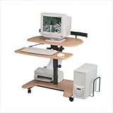 Sleek, contemporary BALT Hi-Lo Workstations are ideal for areas where space is a premium. Pneumatic adjustment is quick and easy to change. 2" casters, sliding keyboard tray and CPU holder included. Color: teak with black frame.