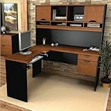 Increasing the efficiency and productivity of small spaces, the Innova collection has an executive feel but was conceived with your needs in mind. The Hutch doors and return portion offer an intricate cut out curved design that gives this L-shape a softer modern twist. Add the free standing Innova Peninsula Table for a little extra work space. Features: Finished in Tuscany Brown Durable 1" commercial grade work surfaces with melamine finish that resist scratches, stains and burns Hutch with two doors provides enclosed storage space with open spaces ideal to store books and binders and also convenient paper shelves Pedestal with one utility drawer and one file drawer File drawer on ball-bearing slides with letter,legal filing system One lock secures both drawers Keyboard tray on ball-bearing slides U-Shape configuration when attached to the Peninsula (152708) Reversible design can be configured for left or right side set-up Ships in two boxes Specifications: Overall dimensions: 66.44"H x 58.81"W x 59"D
