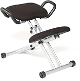 Powder coated steel frame; upholstered seat and knee support. Adjustable height, rubber coated handgrips. hair moves forward and back on rollers.