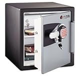 Keep your valuables safe from theft and damage in this electronic safe. To make sure your valuables are protected, this office safe features an advanced LCD electronic lock system with backlit keypad, programmable PIN access and tubular key lock. But that's not all, it also utilizes six live-locking bolts. Inside the safe, you can place your valuables in the key rack and compartment, multi-position drawer, multi-position shelf or the door pocket. The protection features display the quality of this safe: ETL Verified for two-hour fire protection of CDs, DVDs, USB drives and memory sticks up to 1850 F; water-resistant; UL classified two-hour fire protection; and UL classified 30 ft. drop test. Outer Width: 16 11/32 in; Outer Depth: 19 5/16 in; Outer Height: 17 27/32 in; Capacity (text): 1.2 ft3. Door Pocket; Electronic Safe; Fire Safe; Fire-Safe 1.2 Cu. Ft. Capacity Electronic Safe; Key Rack; SENTRY; Protective; Vault; Depository; Strong; Box; Safety