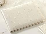 This 10" x 6.5" guest book is covered in ivory satin embroidered with an ivory leaf and vine pattern. The guest book has 30 two-sided pages. The front of the first page reads: "This is the Keepsake of ,On the occasion of, On this the day of in the year." The back of the first page is blank. The next 29 pages are for signatures -- the front and back of each page has the header "Guests" and 10 blank lines. This book fits 580 signature lines total. Also available in white.