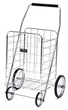 Ideal for grocery shopping and carrying laundry. Easily folds, opens, and stores. Rubber grip handle. Heavy, rounded, tubular vertical frame front and back. Capacity holds up to 150 lb. or 3.5 cu. ft. Heavy chromed steel wheels welded on the inside of rim with heavy spokes. Folds compactly for storage. Easy-to-assemble. Solid genuine rubber tires. Easily hooks to in-store grocery carts. Only weighs 15 lb. No. NTC001-RD: Red No. NTC001-WH: White No. NTC001-BK: Black No. NTC001-CH: Chrome