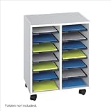 Go-Go office gadget! Go Cart? your files with the 14 compartment organizing cart. A must for every workspace! Handy mobile carts store under most work surfaces and can be moved to wherever they are needed on four casters (two locking). Pullout literature trays with finger cutouts are removable to expand compartment size. The cart is made of compressed wood with a laminate finish. Assembly required. Features: Fits Folder Size(s): Letter Shelf Weight Capacity: 5 lbs. per shelf Material(s): Furniture Grade Particleboard Compartment Quantity: 14 Letter Size Fits Paper Size(s): Letter Shelf Quantity: 12 Pull-out Shelves Wheel , Caster Style: 4 Casters (2 Locking) Assembly Required Dimensions: 21 1,2"w x 13 1,2"d x 26"h